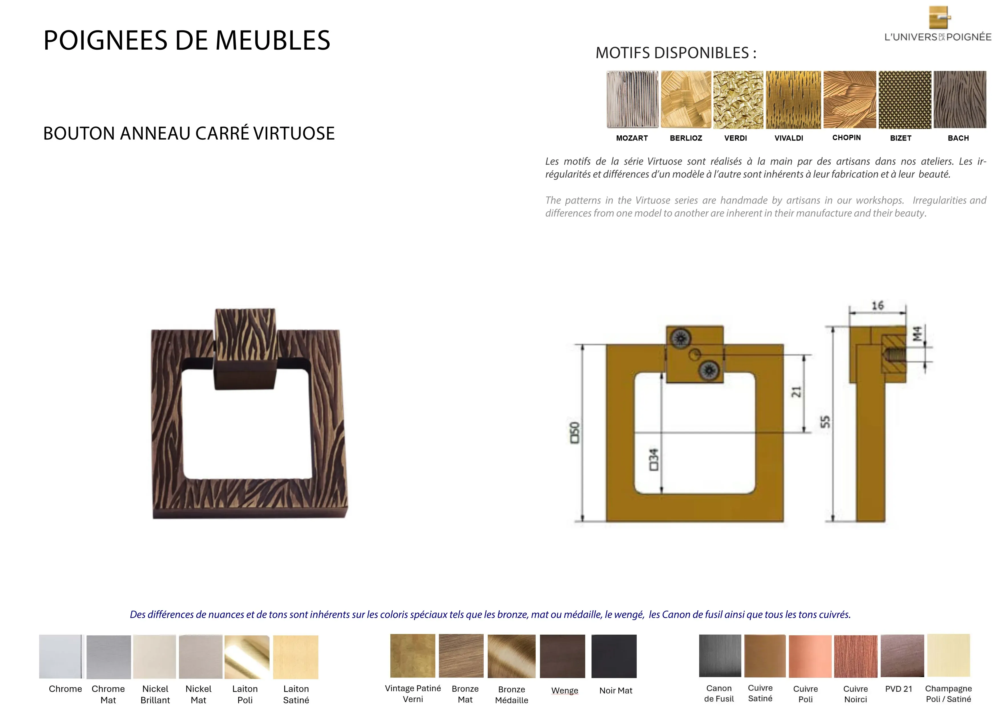 Parce que chaque intérieur mérite une finition sur mesure, le bouton est disponible en plus de 15 coloris différents, parmi lesquels : Laiton satiné ; Laiton poli ; Chrome mat ; Chrome brillant ; Nickel mat ; Nickel brillant ; Bronze mat ; Bronze médaille ; Bronze vintage ; Wengé ; Blanc ; Noir mat ; Canon de fusil ; Cuivre satiné ; Cuivre brillant ; Cuivre noirci ; Champagne mat ; Champagne brillant