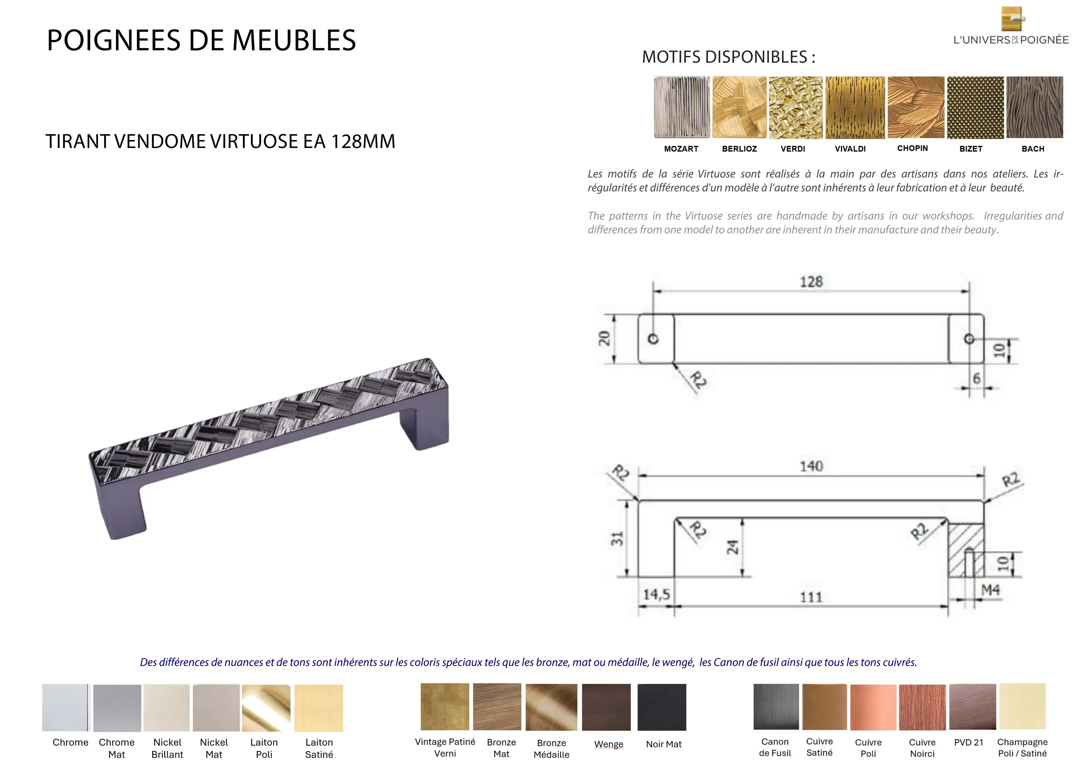Parce que chaque intérieur mérite une finition sur mesure, le tirant de meuble est disponible en plus de 15 coloris différents, parmi lesquels : Laiton satiné ; Laiton poli ; Chrome mat ; Chrome brillant ; Nickel mat ; Nickel brillant ; Bronze mat ; Bronze médaille ; Bronze vintage ; Wengé ; Blanc ; Noir mat ; Canon de fusil ; Cuivre satiné ; Cuivre brillant ; Cuivre noirci ; Champagne mat ; Champagne brillant