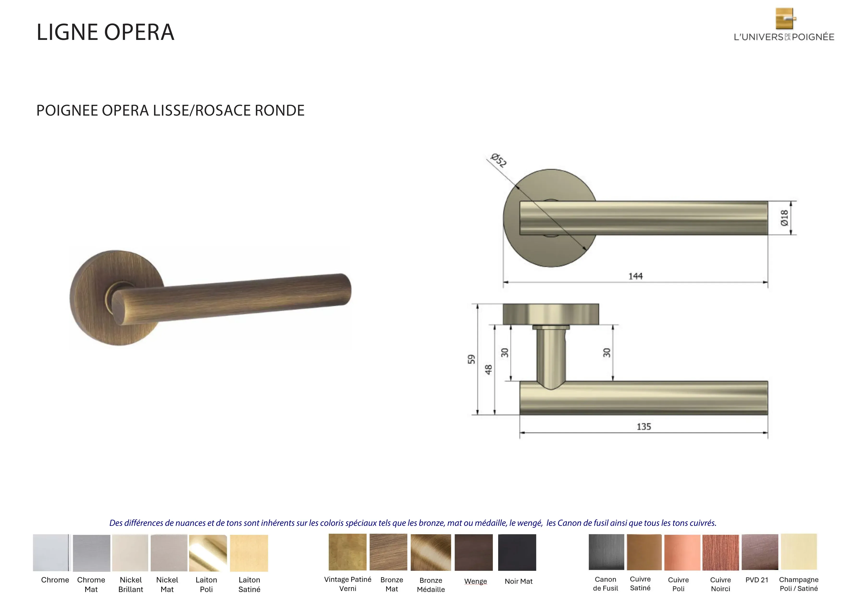 La poignée de porte Opéra peut également être complétée par une large gamme d’accessoires assortis pour une harmonie parfaite dans votre intérieur. Boutons et poignées de meuble, poignées de fenêtre, plaques de tirage : chaque élément est conçu pour sublimer vos portes, fenêtres et mobiliers dans un style cohérent et raffiné.