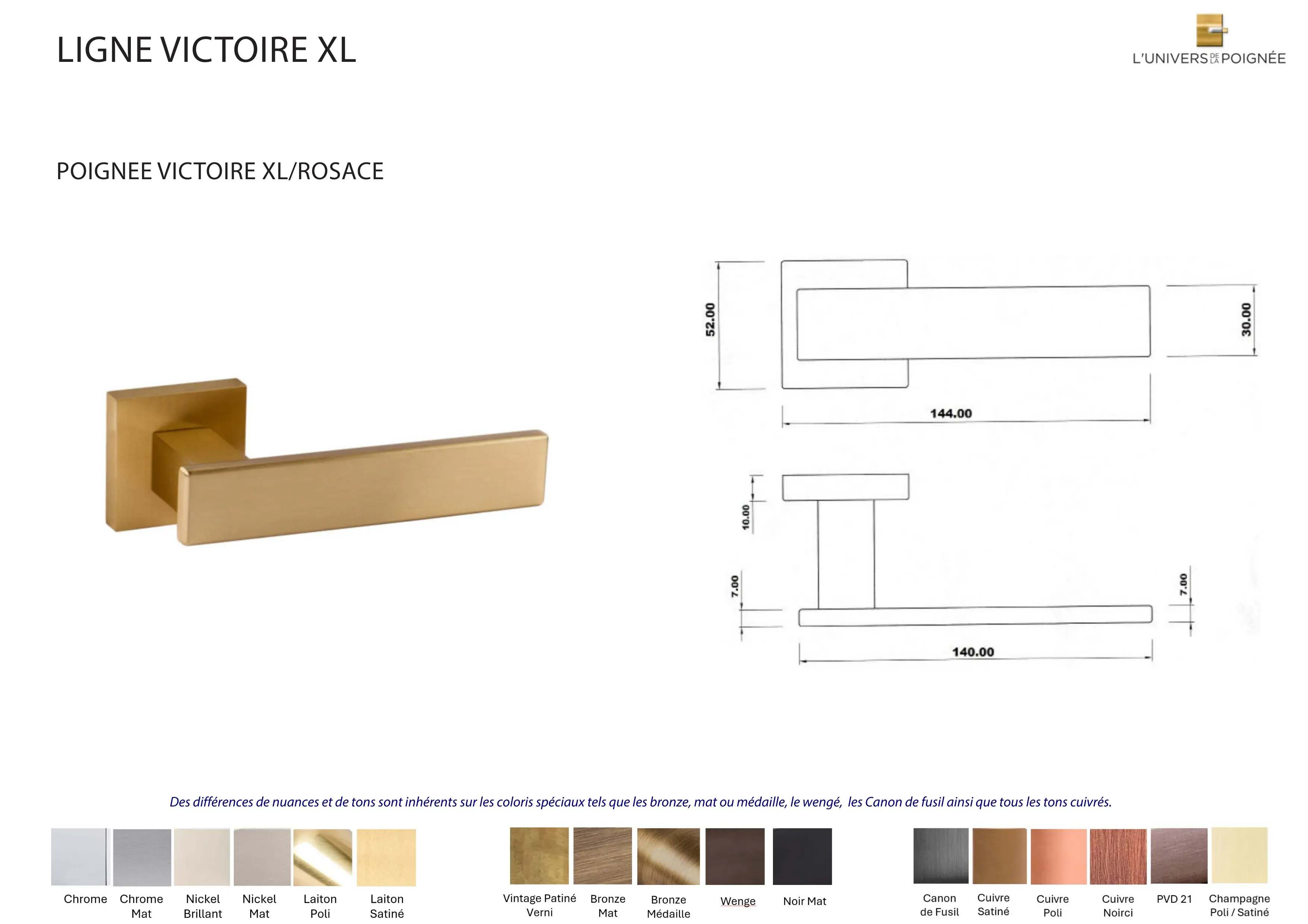 Elle est également déclinable en plus de 15 coloris sophistiqués, parmi lesquels : Laiton satiné ; Laiton poli ; Chrome mat ; Chrome brillant ; Nickel mat ; Nickel brillant ; Bronze mat ; Bronze médaille ; Bronze vintage ; Wengé ; Blanc ; Noir mat ; Canon de fusil ; Cuivre satiné ; Cuivre brillant ; Cuivre noirci ; Champagne mat ; Champagne brillant