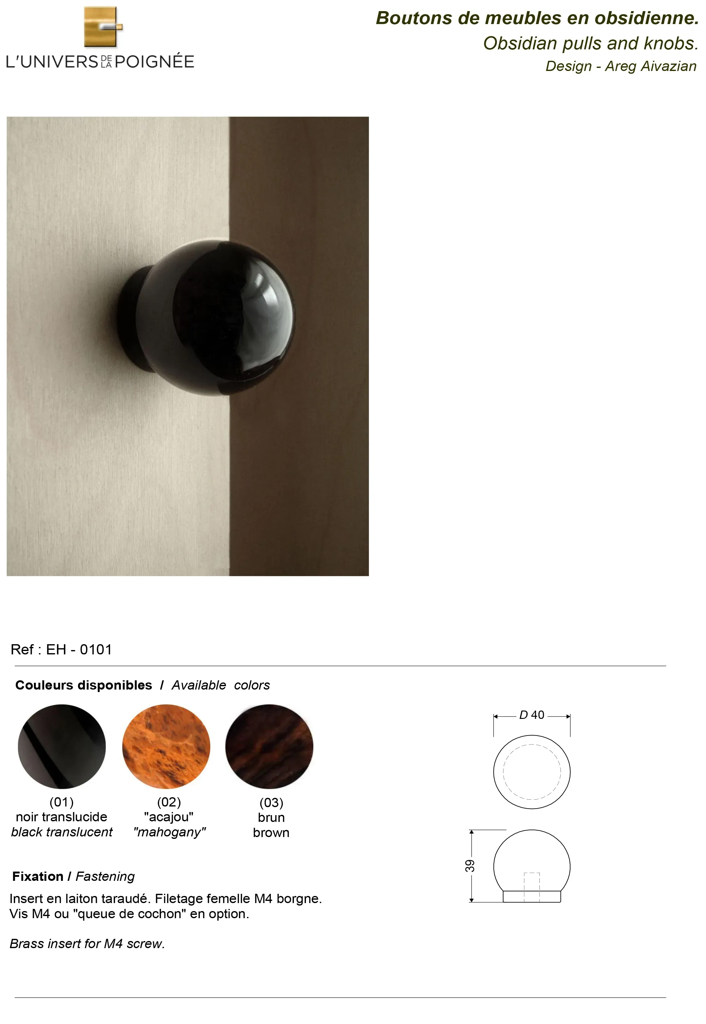Disponibles en trois finitions selon les modèles – noir translucide, brun et acajou – ces poignées apportent une touche de caractère et d’élégance aux façades de placards et meubles. Leur surface lisse et brillante met en valeur la profondeur et les reflets naturels de la pierre, ajoutant une dimension sophistiquée et unique à chaque pièce.